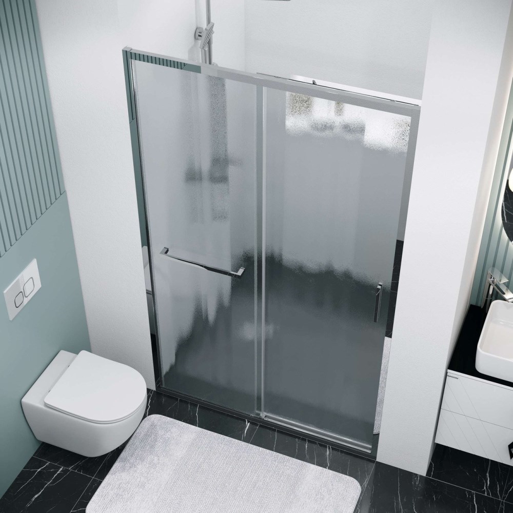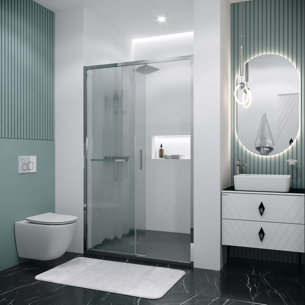 Душевая дверь Grossman Style имеет размер 130х195 см. Прямоугольная форма, цвет профиля — хром, исполнение полотна двери — рифленое. Конструкция состоит из 2 секций. Раздвижная механизм открывания. Устанавливается в облицованный кафелем угол или нишу ванной.