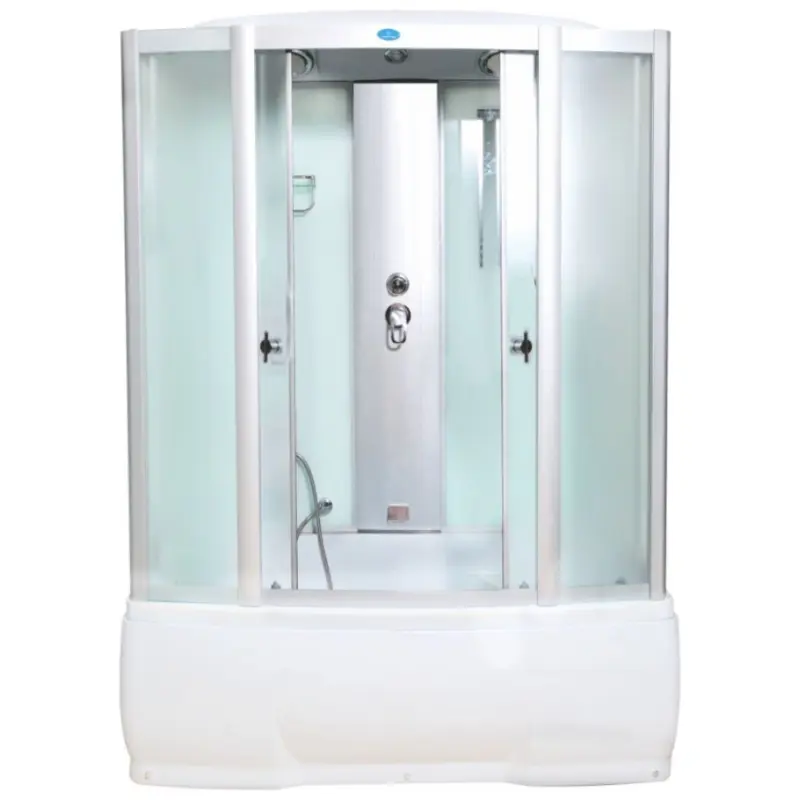 Душевая кабина Водный мир имеет размер 150х85 см. Форма — прямоугольная , цвет хром, исполнение полотна двери матовое. Механизм открывания раздвижной.