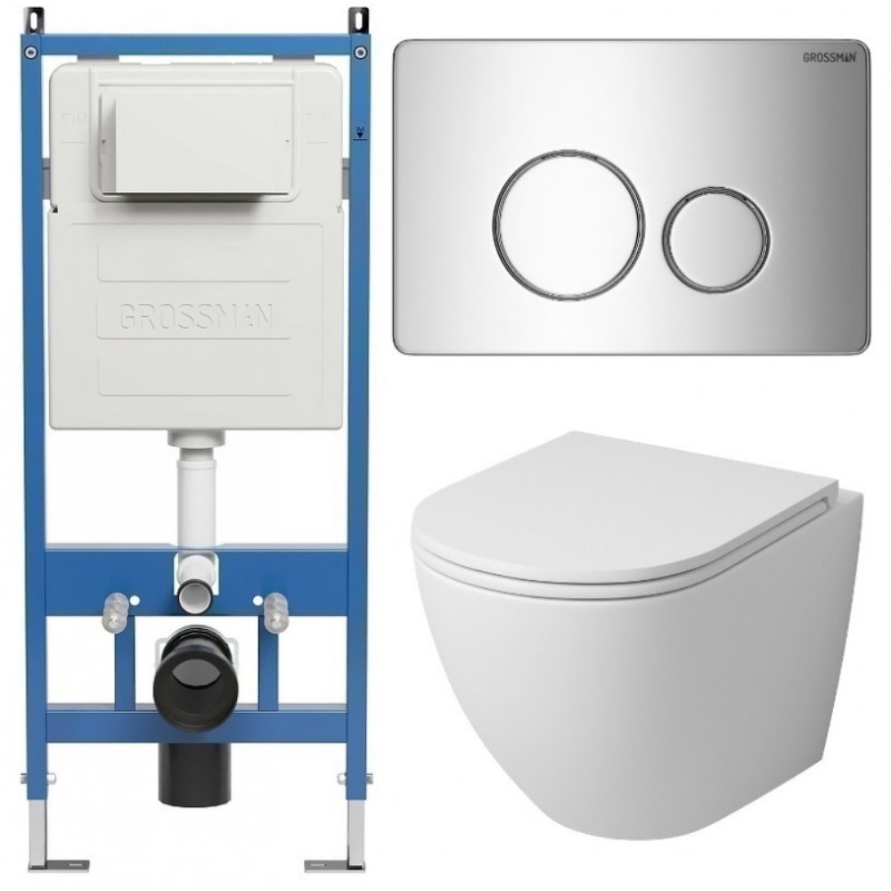 Комплектация: Инсталляция Grossman + Унитаз подвесной Grossman GR-4455MS + Крышка-сиденье Grossman + Комплект креплений + Звукоизолирующая прокладка + Клавиша смыва Grossman 700.K31.05.10M.10M.