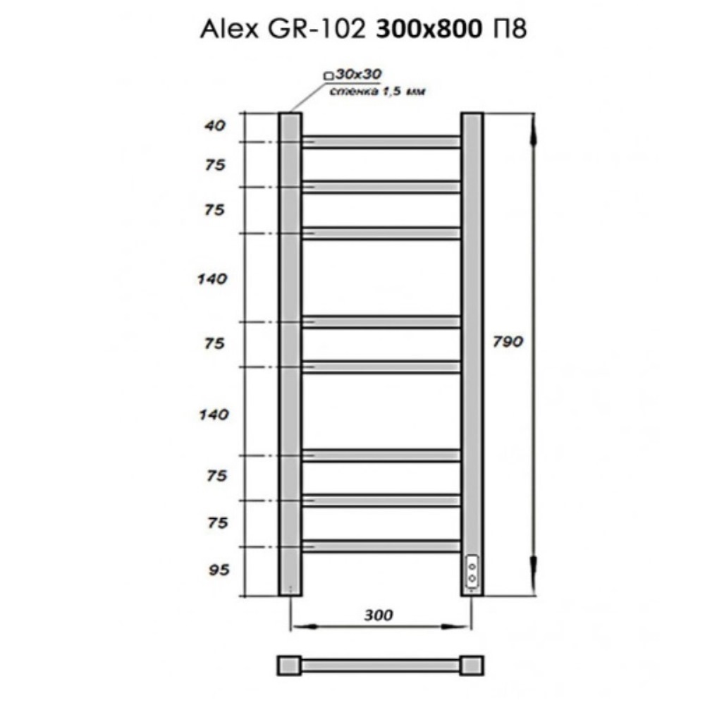 Полотенцесушитель электрический Grois Alex с высотой 79 см., используется для обогрева и сушки помещения. Нижнее подключение. Изготовлен Изготовлен из нержавеющей стали.