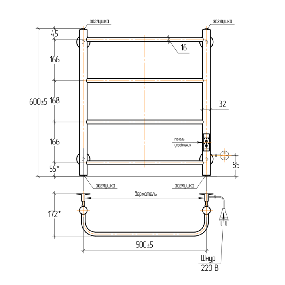 Полотенцесушитель электрический Тера Мост с высотой 60 см., используется для обогрева и сушки помещения. Нижнее подключение. Изготовлен из нержавеющей стали.