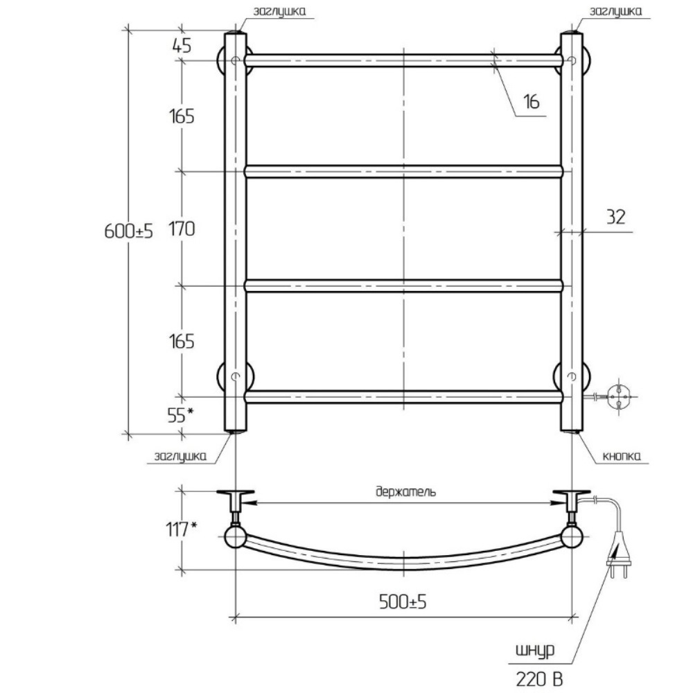 Полотенцесушитель электрический Тера Ребро 50х60 кнопка включения, телескоп.держатели Хром глянцевый ПСК-10-02