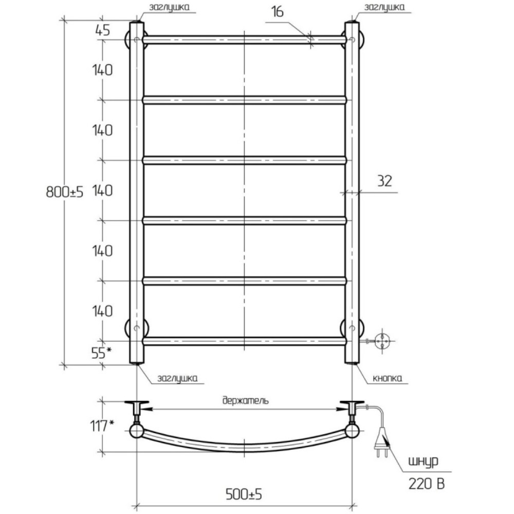 Полотенцесушитель электрический Тера Ребро 50х80 кнопка включения, телескоп.держатели Хром глянцевый ПСК-10-03