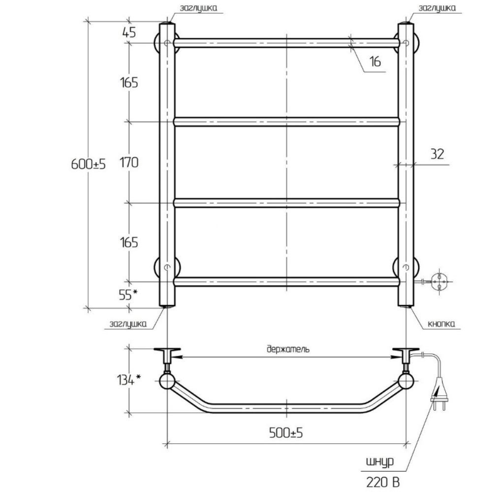 Полотенцесушитель электрический Тера Виктория 50х60 кнопка включения, телескоп.держатели Хром глянцевый ПСК-11-02